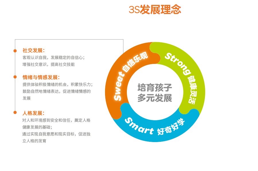 2018年,我们继续向前,启动3S发展理念和品牌升级计划,以全新的品牌形象与活力,继续助力家庭和孩子充分成长。从Sweet - Strong - Smart三个领域驱动金宝贝的课程内容研发和教学系统的设计,让宝贝在自主探索和体验中实现个性情商、体能感知、智能认知的多元发展。
